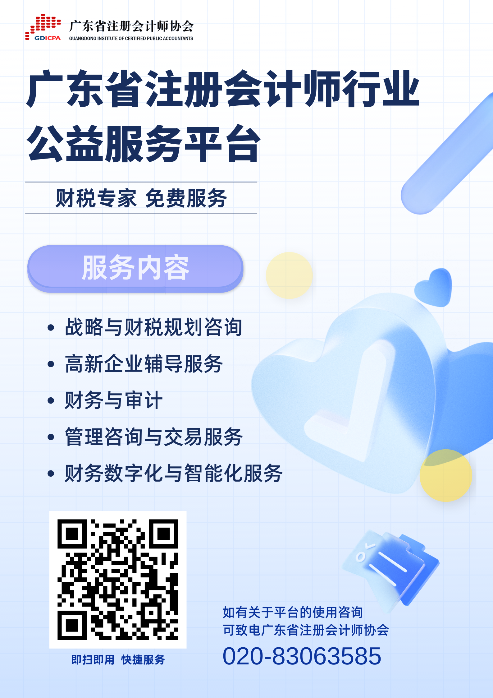 为全力支持“百县千镇万村高质量发展工程”,帮助产业园区企业经营提能升级,广东省注册会计师协会搭建行业公益服务平台,将通过“专业+科技”的方式,为企业提供免费的战略与财税规划咨询、高新企业辅导服务、财务与审计、管理咨询与交易服务、财务数字化与智能化服务等专业咨询服务。